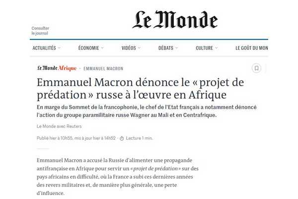 A la suite du State Department US (**), Macron, continateur de Foccart et de Le Drian, se lance dans une grande offensive de propagande et de médiamensonges contre la Russie en Afrique et contre la RCA. Emmanuel Macron dénonce le « projet de prédation » russe à l’œuvre en Afrique (sic). En marge du Sommet de la francophonie, le chef de l’Etat français a notamment dénoncé « l’action du groupe paramilitaire russe Wagner au Mali et en Centrafrique ».