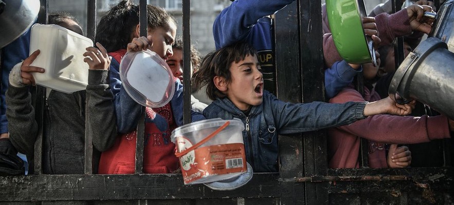 Des enfants attendent de recevoir de la nourriture dans la ville de Rafah, au sud de Gaza.