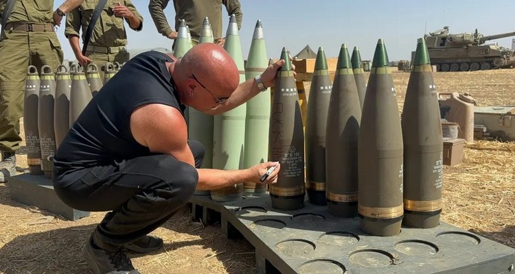 Le chanteur David Draiman, du groupe Disturbed, signant un obus destiné à être largué sur Gaza lors d’une visite d’une base militaire israélienne, 19 juin 2024 © David Draiman sur le réseau social X