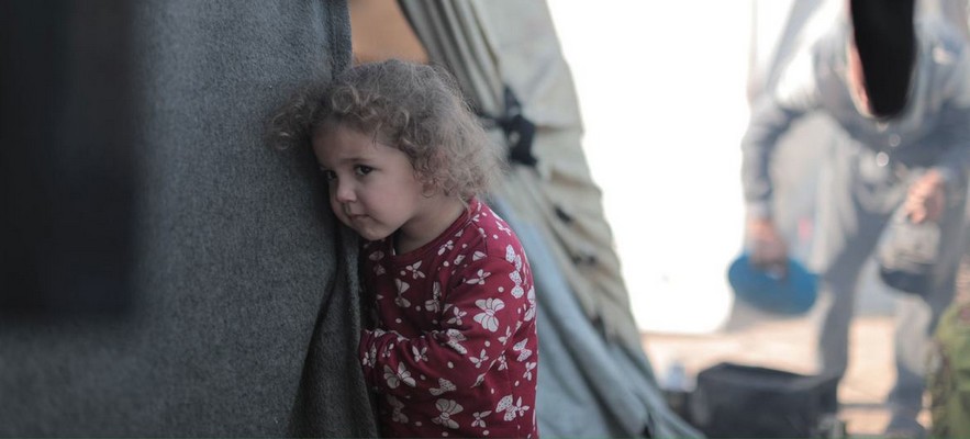 © UNRWA. Une fillette regarde depuis une tente à Gaza.