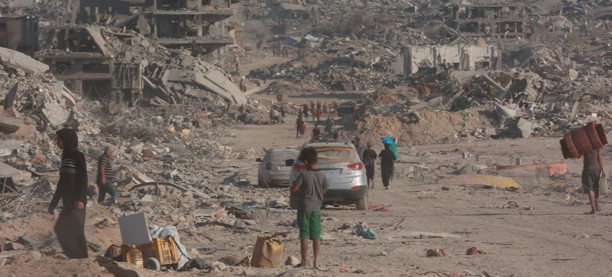 UN News. Des gens au milieu de bâtiments détruits dans la bande de Gaza.