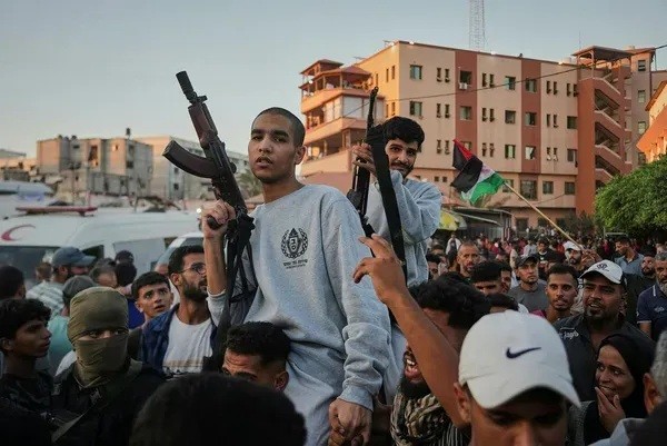 Des prisonniers palestiniens libérés portent des fusils alors qu’ils arrivent dans la bande de Gaza après leur sortie des prisons israéliennes, suite à un accord de cessez-le-feu entre le Hamas et Israël, devant l’hôpital Nasser à Khan Younis, sud de la bande de Gaza, en octobre. Photo Abdel Kareem Hana, AP