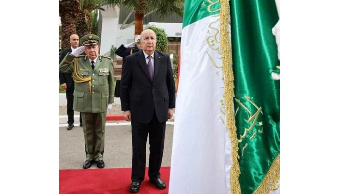 Le Président Tebboune et le Général d’armée Chanegriha saluent le drapeau des martyrs. D.R.