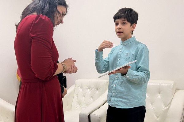 UN News/Abdelmonem Makki. La présidente de l’Assemblée générale, Annalena Baerbock (à gauche), s’entretient avec Ramadan, le jeune auteur de « Biographie de l’enfance et de l’héroïsme : mémoires d’un enfant de Gaza ».
