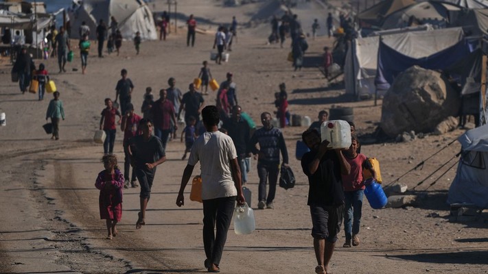 Des Palestiniens transportent des bouteilles d’eau en plastique dans un camp de tentes de fortune pour personnes déplacées, situé le long du littoral de Nuseirat, dans le centre de la bande de Gaza, le mercredi 8 octobre 2025.