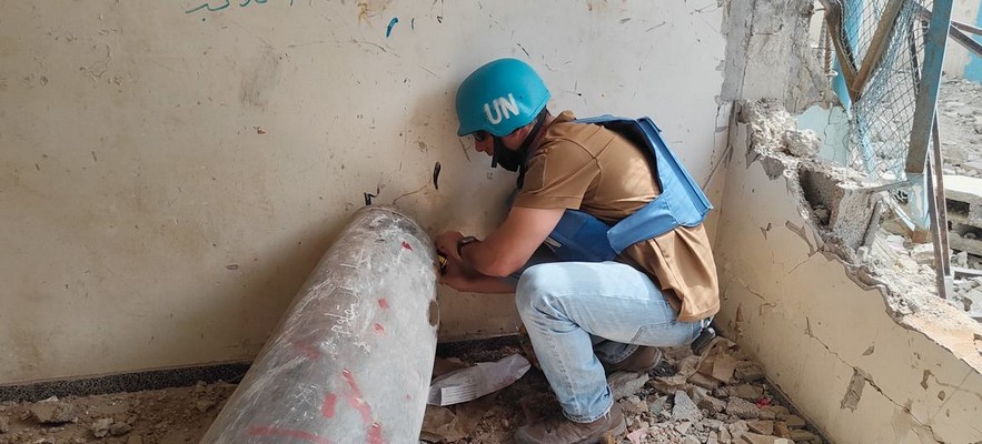 UNMAS. Un agent de l’UNMAS procède à l’inspection d’une école à Khan Younis, dans le sud de Gaza.