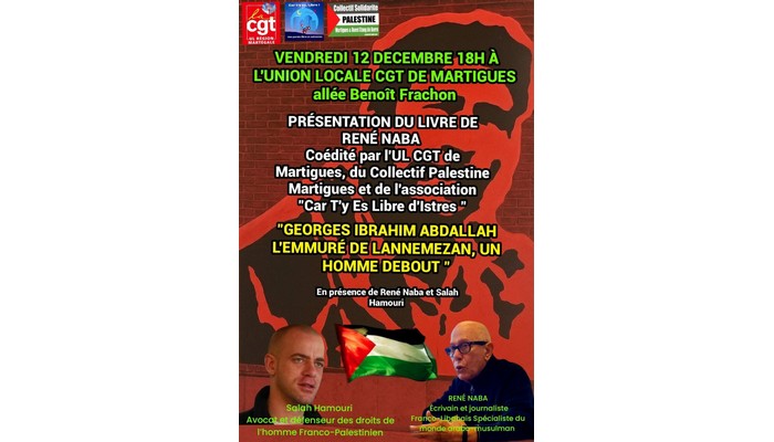 Cette conférence se tiendra en présence de l’auteur de l’ouvrage René Naba et de ses co-éditeurs : L’Union Locale CGT de Martigues, Thierry Luchon, Comité Palestine Martigues, Charles Hoareau (Rouge Midi), ainsi qu’Adil Fajry, président exécutif de « Car t’y es Libre », dont l’auteur en est le président d’honneur ; ainsi que de Salah Hamouri, avocat.