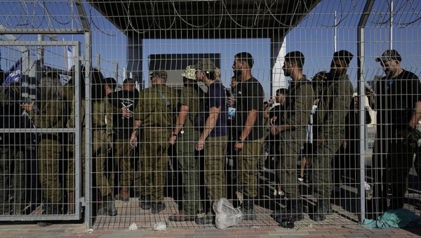 Des soldats israéliens se rassemblent à l’entrée de la base militaire de Sde Teiman pour manifester leur soutien aux soldats interrogés pour avoir maltraité des détenus, le 29 juillet 2024. [AP Photo/Tsafrir Abayov]