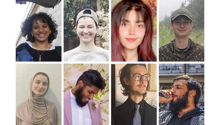 Les huit grévistes de la faim: En haut, de gauche à droite: Qesser Zuhrah, Amu Gib, Heba Muraisi, Jon Cink. En bas, de gauche à droite : Teuta Hoxha, Kamran Ahmed, Lewie Chiaramello, Umer Khalid [Photo: Prisoners for Palestine]