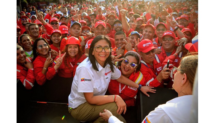 Photo : Delcy Rodriguez, la présidente par intérim du Venezuela, avec les travailleur(se)s pétroliers