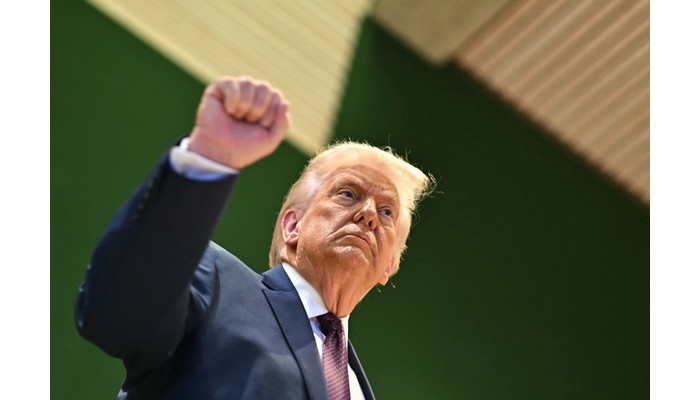US President Donald Trump rises his fist after the "Board of Peace" meeting during the World Economic Forum (WEF) annual meeting in Davos on January 22, 2026. US President Donald Trump will show off his new "Board of Peace" at Davos on January 22, 2026 burnishing his claim to be a peacemaker a day after backing off his own threats against Greenland. Originally meant to oversee the rebuilding of Gaza after the war between Hamas and Israel, the board's charter does not limit its role to the Strip, and has sparked concerns that Trump wants it to rival the United Nations. (Photo by Fabrice COFFRINI / AFP)