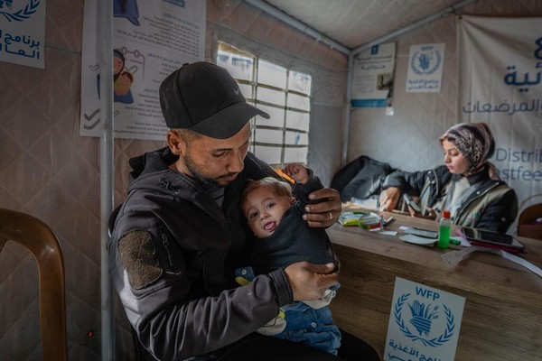 © PAM/Maxime Le Lijour. Un homme avec son enfant dans un site de nutrition dans le camp de Falastin à Gaza.