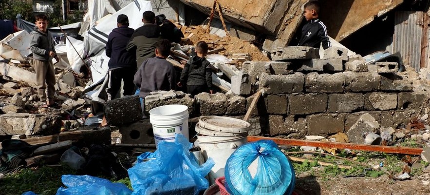 UN News. Des enfants et des adultes dans les décombres de bâtiments effondrés à Gaza.