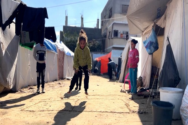 ONU Info. Des enfants jouent au camp de Sadaka, à l’ouest de Deir al-Balah,
