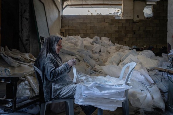 © WFP/Maxime Le Lijour. Une femme à Gaza confectionne des sacs