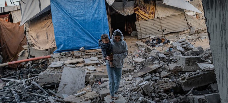 © WFP/Maxime Le Lijour. Une femme et un enfant marchent parmi les ruines d’une maison à Gaza.