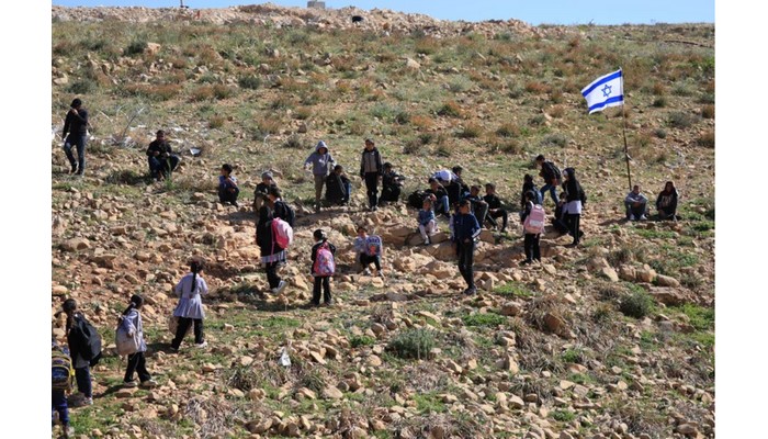 13 avril 2026. Des colons israéliens installent des barbelés et des drapeaux et bloquent le passage des enseignants